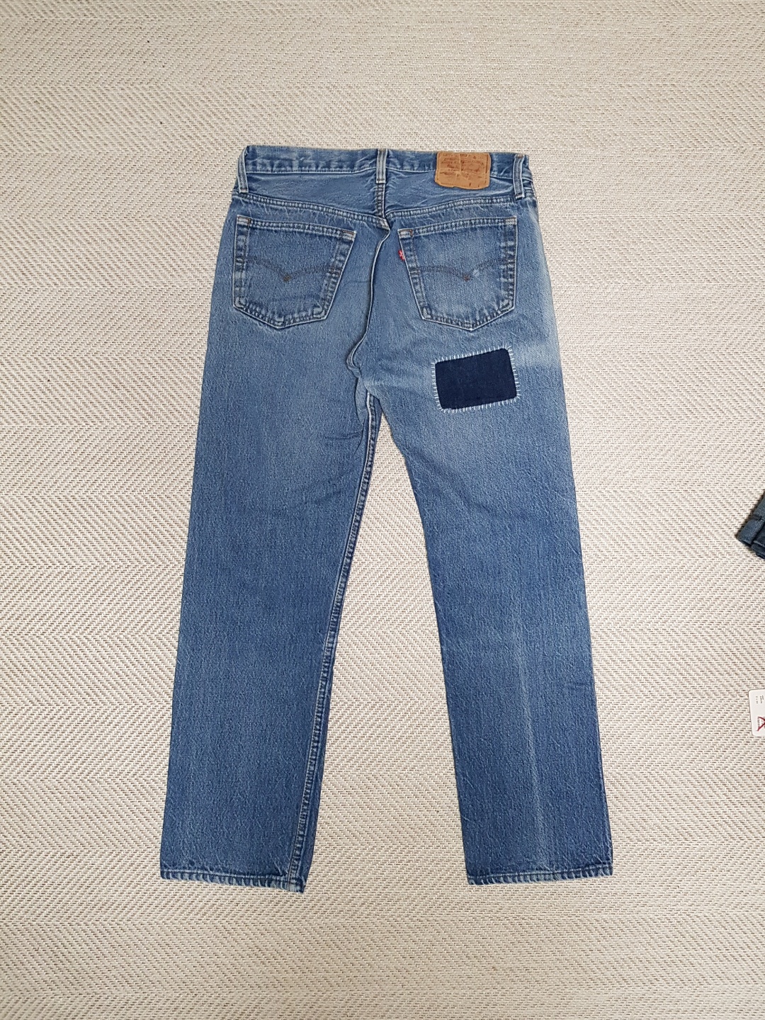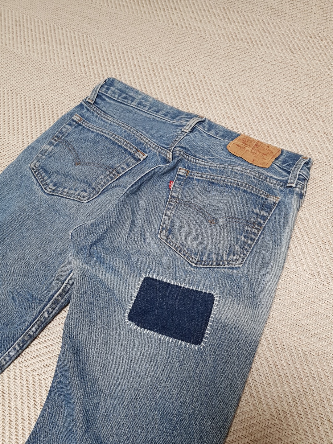 하지만 직장인이라면 물건 하나 사는것도 신중하고 소중한것 아니겠습니다. 거금을들여 구매한 바지를 버릴 순 없다 싶어 커스텀 작업을 해야겠다 생각했습니다!(빈티지 리바이스 좋아하시는 분이라면 필연적으로 빠져드는 패치워크) 물론 제가 한 건 아니고 금손 아내에게 의뢰하였습니다. 의뢰비는 제가 판매하는 옷 중에 맘에 들어 하는 옷 주기. 부부라면 이렇게 서로 윈윈하는 악어와 악어새 같은 관계가 가장 좋은게 아니겠습니까