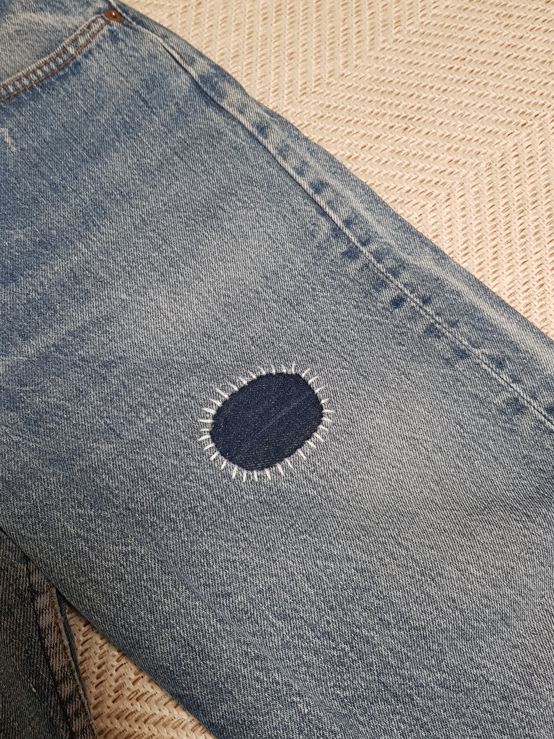 패치워크는 앞뒤로 가볍게 넣었습니다. 마음 같아서는 두 세군에 동그랗게 더 넣고 싶었는데 추가 작업 의뢰를 하다가는 뼈도 못 추릴 것 같아서 상당히 만족하고 고맙다고 인사드리고 마무리하였습니다. 근데 실제로 넘넘 이뻐서 만족하고 지금도 제 최애 청바지입니다.